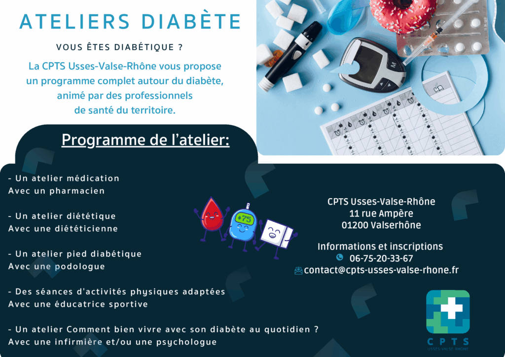 La CPTS organise un programme à destination des personnes diabétiques. Composé de différents ateliers ,qui se déroulent sur plusieurs sessions de 1h00 à 2h00 répartis sur deux mois. Ce programme complet permet aux participants d’aborder leurs interrogations avec différents professionnels de santé.