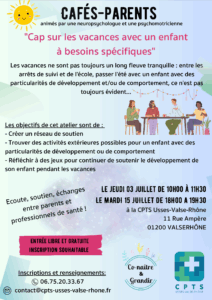 Ces permanences ont une visée préventive à l’issue desquelles les professionnels de santé vous proposerons des ateliers avec vos enfants correspondant aux problématiques soulevées lors des temps d’échanges.